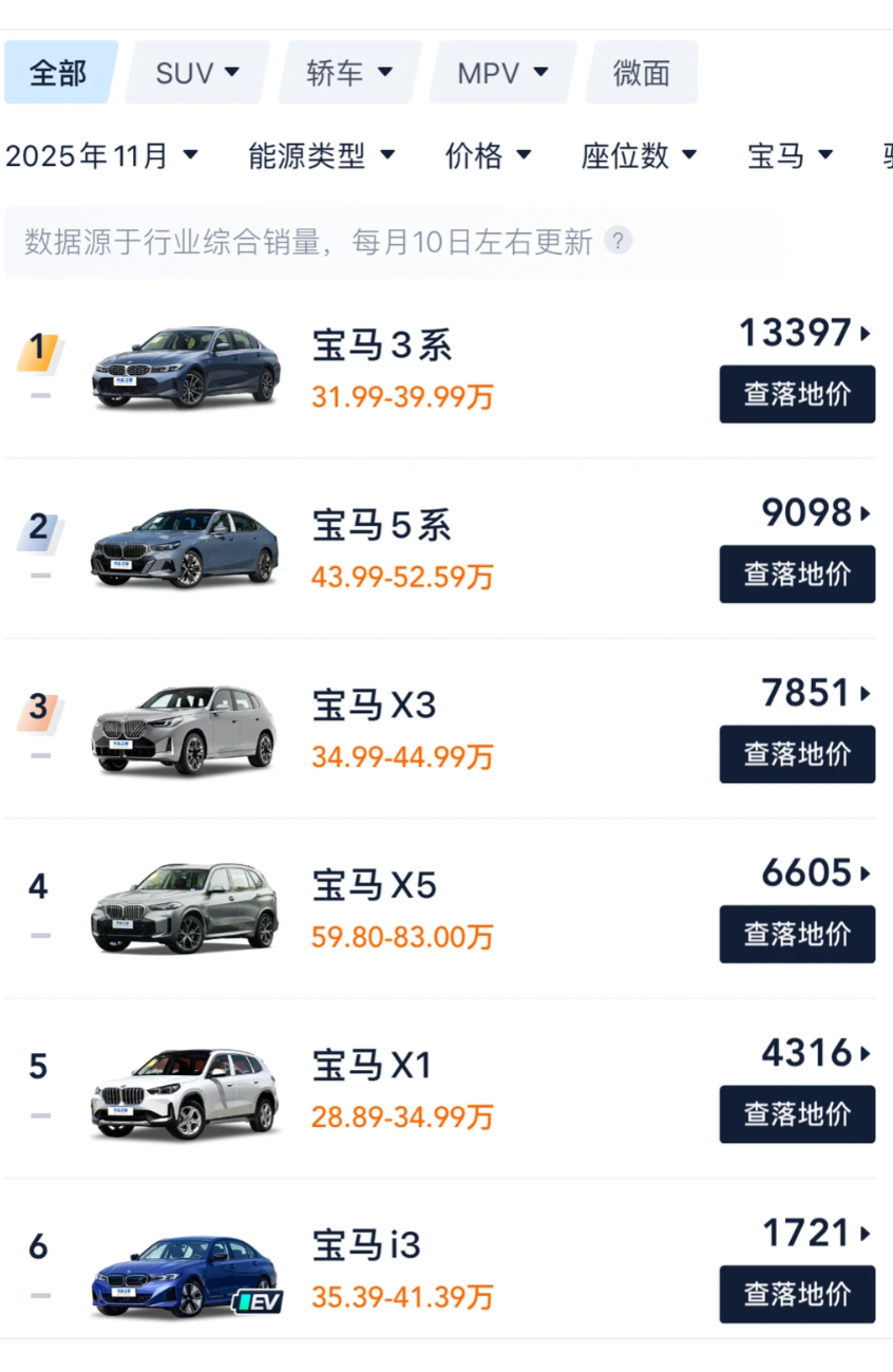 2025 年 11 月的销量数据,给宝马乃至整个 BBA 阵营泼了一盆冷水 —— 宝马 3 系 13397 辆、5 系 9098 辆、X3 7851 辆、X5 6605 辆,曾经的销量支柱纷纷出现下滑态势,网友那句 “BBA 的好日子以后是真没有了”,不再是夸张调侃,而是新能源时代市场格局重构的真实写照。